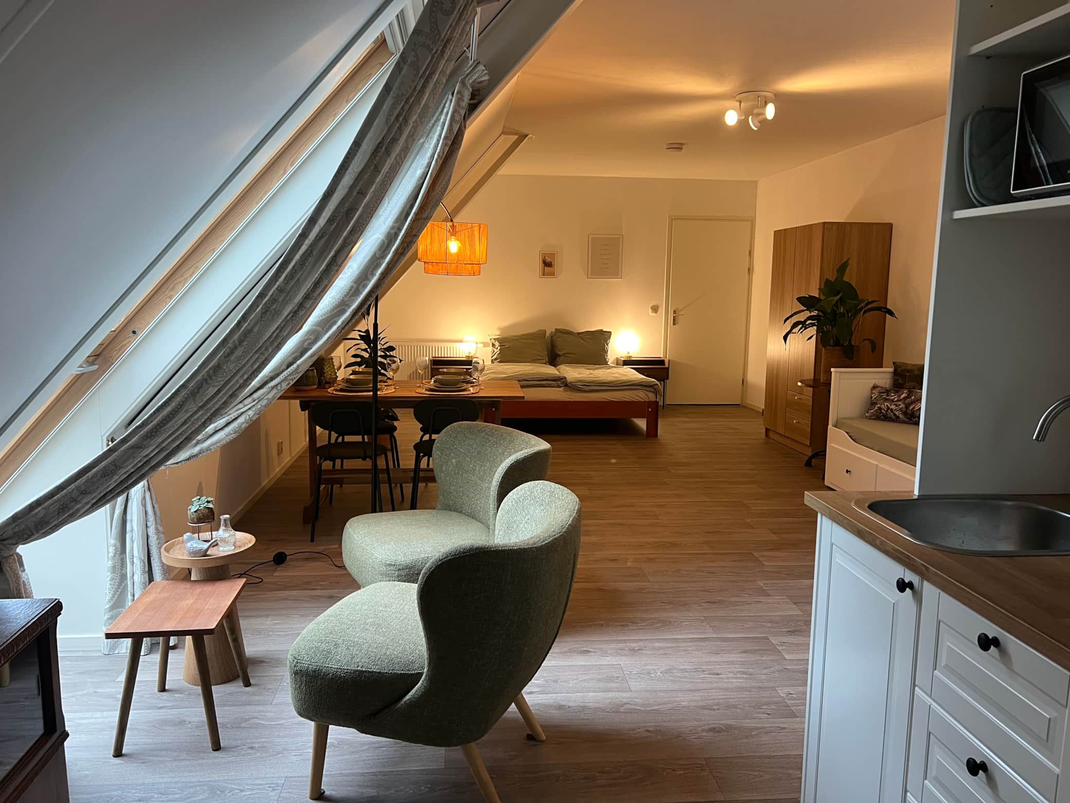 De kitchenette is voorzien van een koelkast, magnetron, Nespresso-apparaat, waterkoker, servies en bestek. Er is ook een kleine elektrische 2-pits kookplaat die je op het aanrecht kunt plaatsen voor eenvoudige maaltijden. Daarnaast beschikt de studio over een nette eigen badkamer met douche en toilet, direct grenzend aan de kamer.